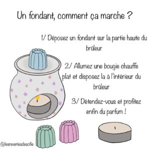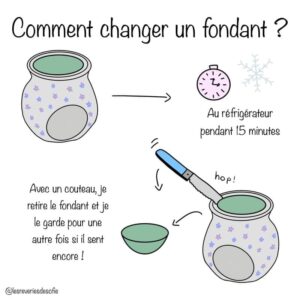 Les fondants parfumés n’ont pas de mèche et ne brûlent pas directement. Ils fondent simplement sous l’effet de la chaleur, ce qui permet :